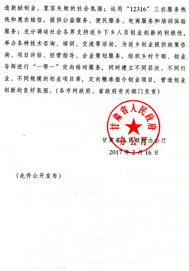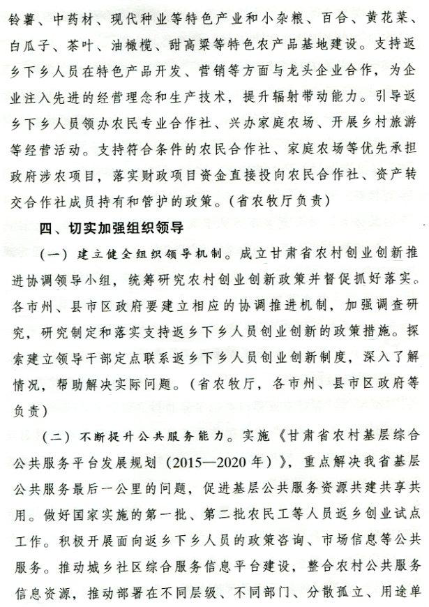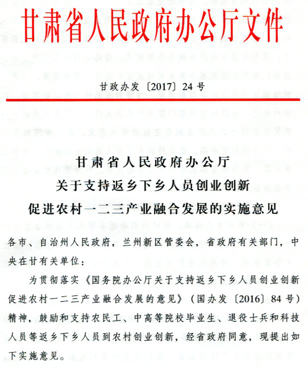 现将甘肃省人民政府办公厅《关于支持返乡下乡人员创业创新促进农村一二三产业融合发展的实施意见》(甘政办发〔2017〕24号)转发给你们,请按照省上部门及行业分工抓好贯彻落实。州农牧局牵头成立州级农村创业创新协调领导小组,定期开展调研及督查,确保相关政策的落地生效,切实解决返乡下乡创业人员工作中的实际问题和困难。